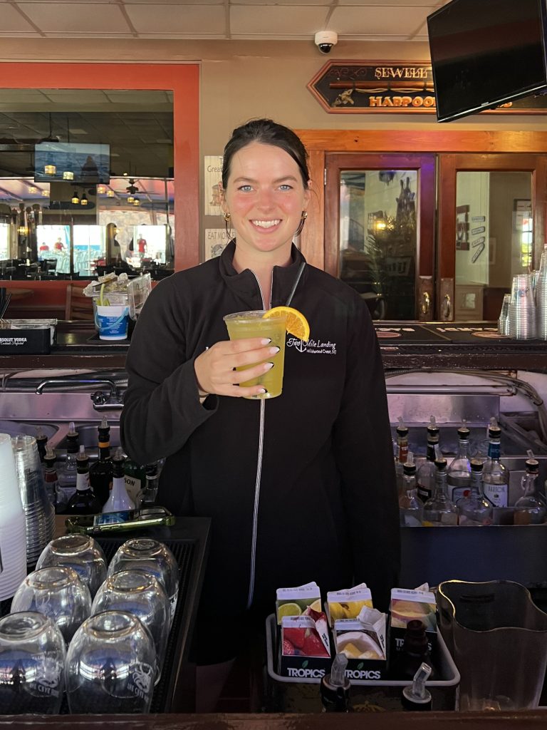 This summer, Mariah will celebrate her third year of employment at Two Mile Landing. She said, “I started bartending here at Crab House towards the end of the season last year. They have been trying to get me a little more experience this year. It has been an overall huge learning experience and a definite shift from serving in a lot of good ways.”
