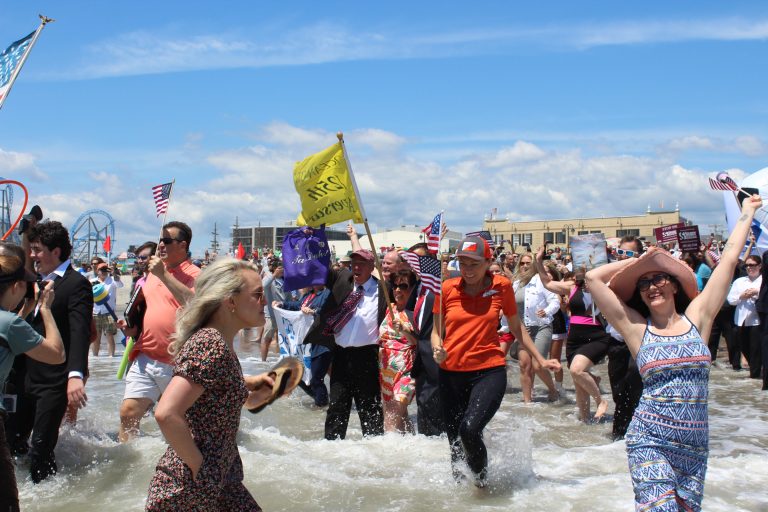 With the ocean officially open, a fully-clothed entourage will then march into the chilly Atlantic Ocean to celebrate the 21st anniversary of the Business Persons Plunge. The Ocean City High School band will play “Pomp and Circumstance” and a banner plane will fly by as local business owners and employees take the first swim of the summer.