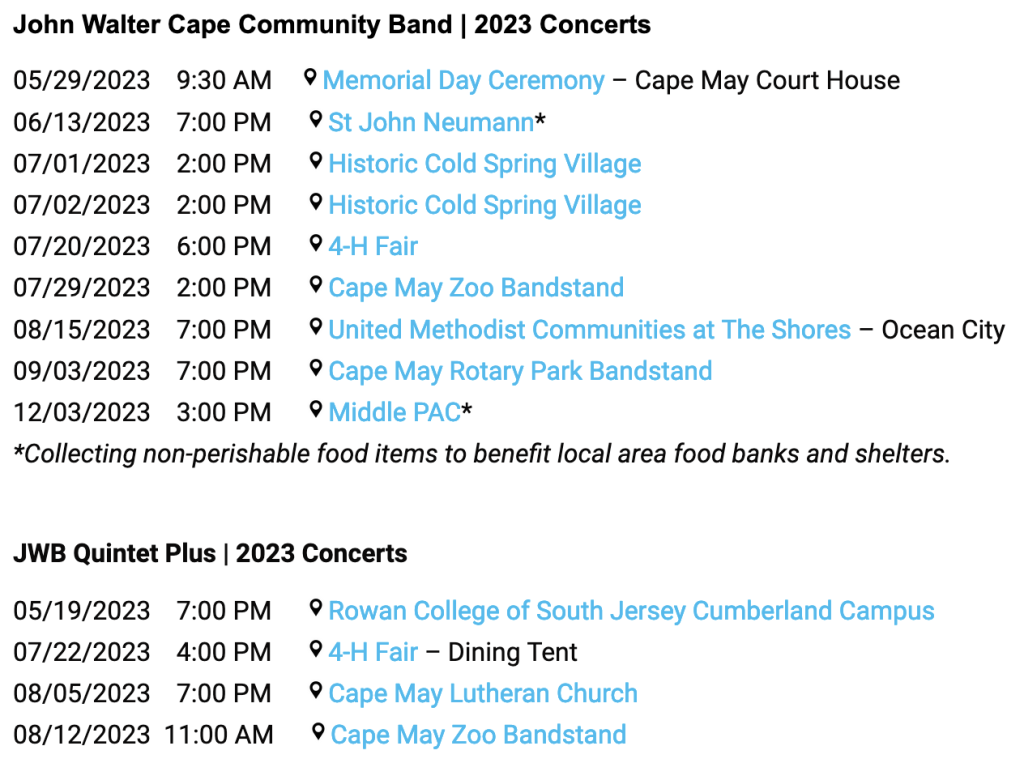 The band performs throughout Cape May County and all of the band’s and quintet’s concerts are free and open to the public. For a listing of upcoming performances, visit johnwaltersband.org